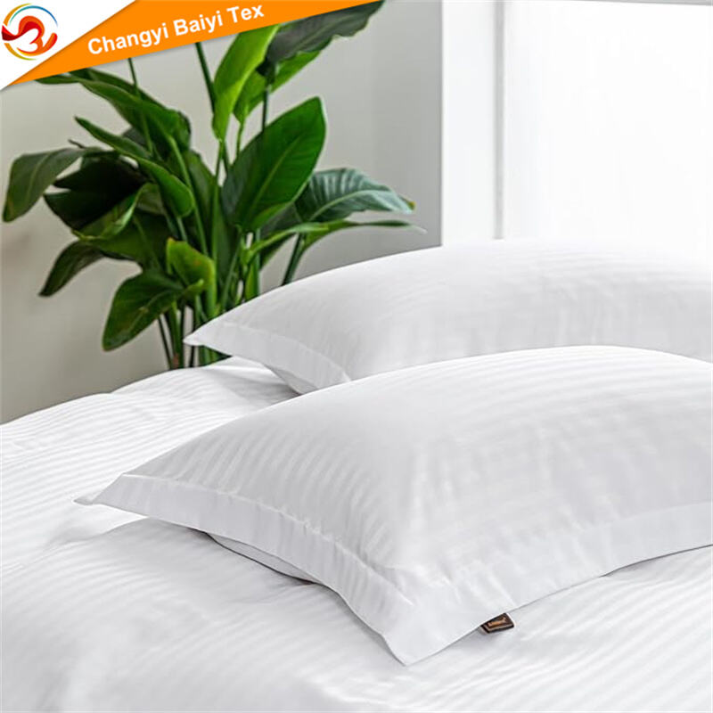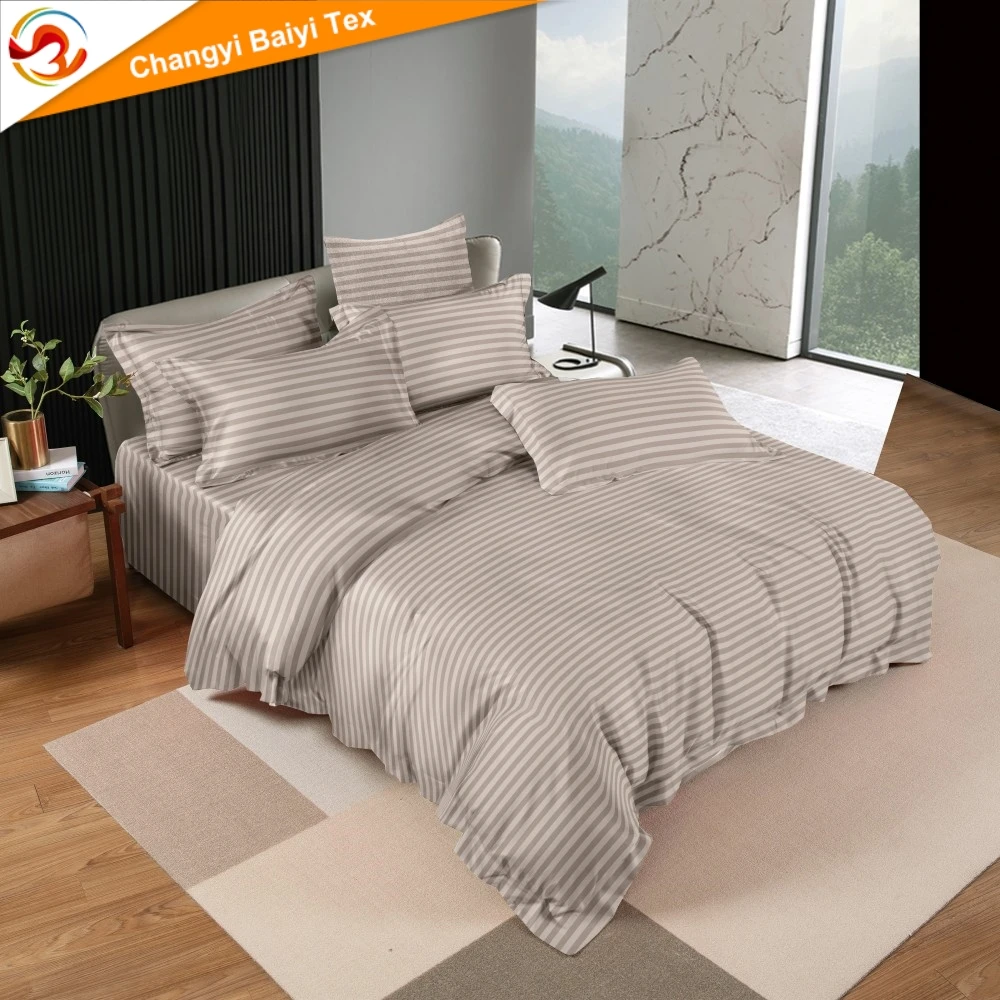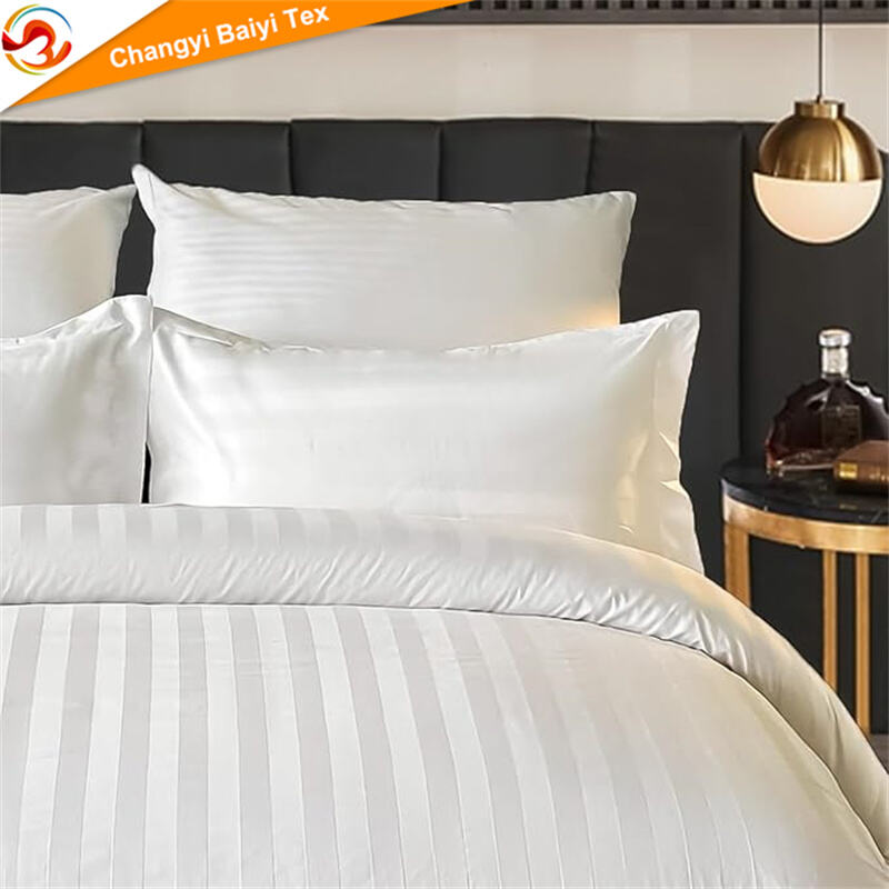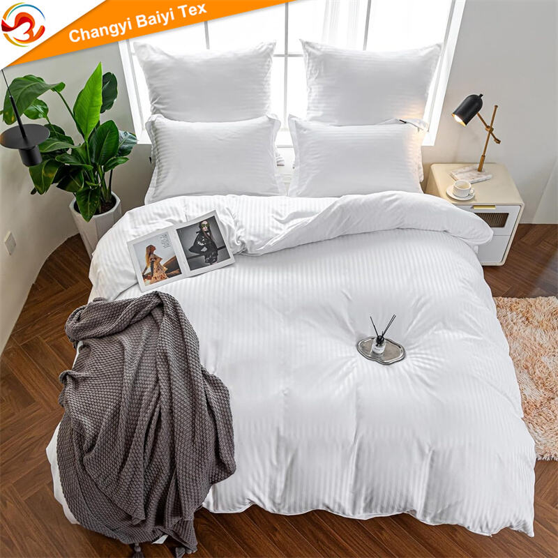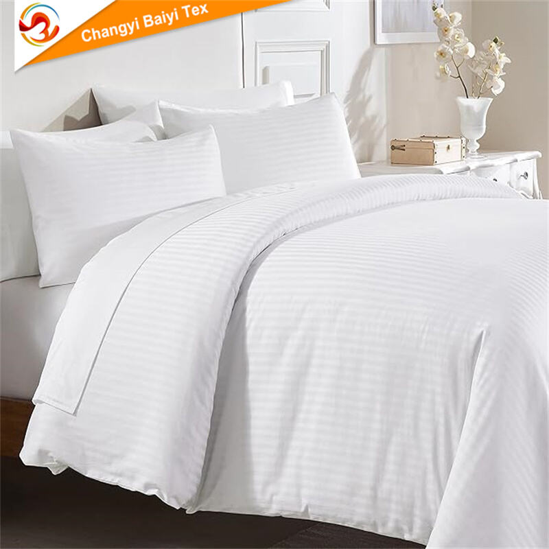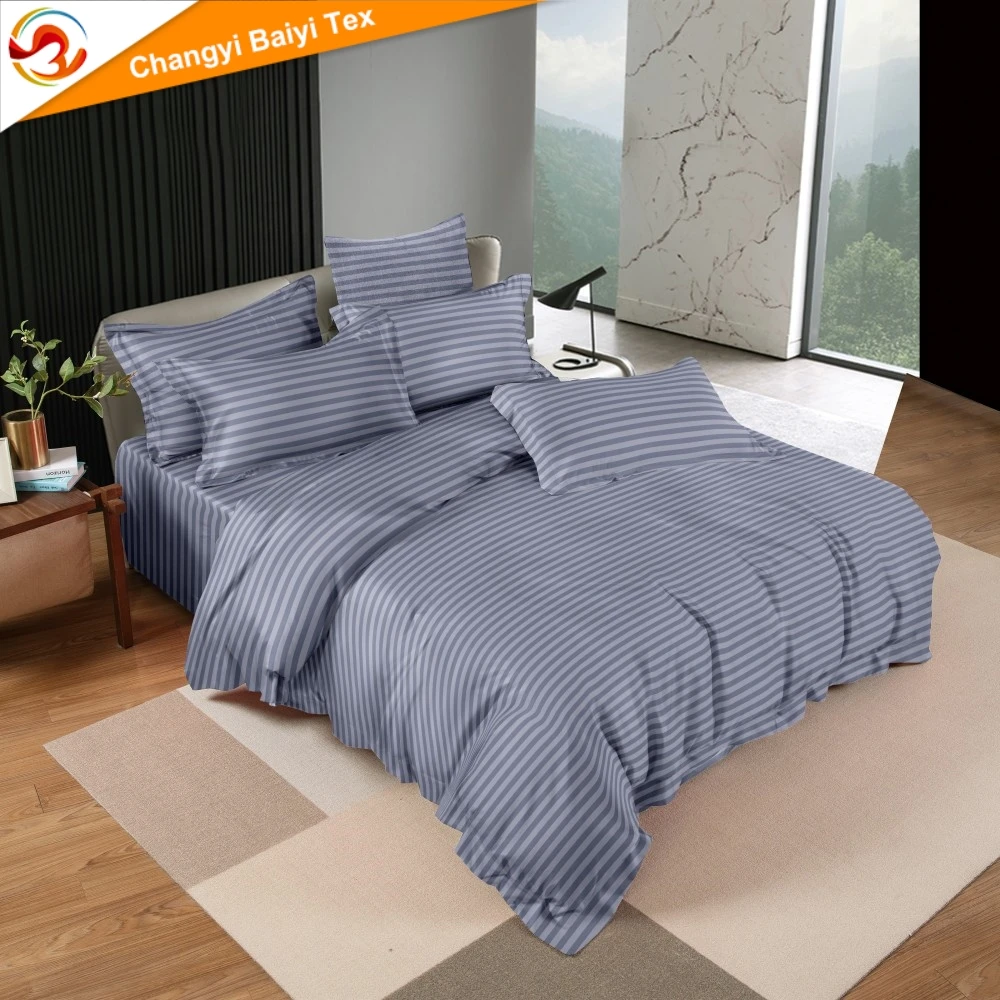 Producent tekstyliów hotelowych oferuje wysokowydajne pościel z poliestru z reliefowym wzorem pasków, oddychającą mikrofibry w jednolitych barwach, komplet prześcieradeł, poszwy na kołdrę i poduszki, luksusowy komplet pościeli domowej 4-sztukowy